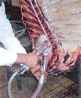 背割り作業の前工程で本装置により脊髄を吸引除去することにより、背割り作業時の拡散による汚染リスクを低減化させる。
